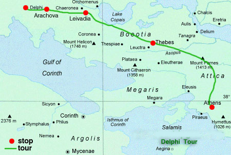 Starting from PiraeusDelphi site is located in lower central Greece, on multiple plateau/terraces along the slope of Mount Parnassus, and includes the Sanctuary of Apollo, the site of the ancient Oracle. This semicircular spur is known as Phaedriades, and overlooks the Pleistos Valley. Southwest of Delphi, about 15 km (9.5 mi) away, is the harbor-city of Kirrha on the Corinthian Gulf.